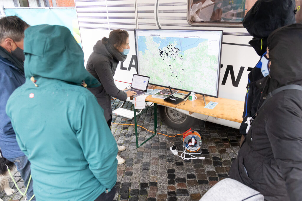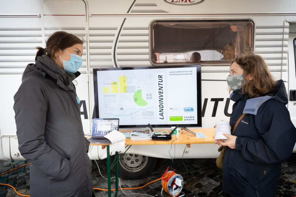 Wir waren ausnahmsweise mal nicht auf dem Land, sondern Mitten in Berlin mit der mobilen Forschungsstation. Und zwar auf dem Mitforschen! Citizen-Science-Festival in der Kultur Brauerei. Leider fiel das Festival am 14. Und 15. Oktober schon in die Zeiten der steigenden Coronazahlen, sodass viel weniger Projekte als geplant anwesend waren. Das schlechte Wetter hat es dann noch den wenigen Gästen nicht ganz einfach gemacht. Dafür hatten wir mit allen Besucher*innen intensive Gespräche – von der Kindergartengruppe bis zum parlamentarischen Staatssekretär Dr. Michael Meister MdB. Aufhänger war nicht selten der Blick der Großstädter*innen auf das Land, der sich gerade in diesen herausfordernden Zeiten sehr zu verändern scheint. Die Stadt wird mit Corona noch enger, als sie es ohnehin schon war. Was das Dorfleben heute ausmacht konnten wir anhand der Zahlen gut erläutern. Gleichzeitig stieß unser Ansatz und Thema auf Interesse. Die anderen Projekte waren eher das, was man als „klassische“ Citizen Science Projekte kennt: dem Gartenschläfer auf die Spur kommen, Stickstoff-Messstationen aufhängen oder Plastik in Gewässern kartieren. Mit der Landinventur betrachtet wir vielmehr die alltägliche Lebenswelt und versucht daraus sozialwissenschaftliche Erkenntnisse zu generieren.